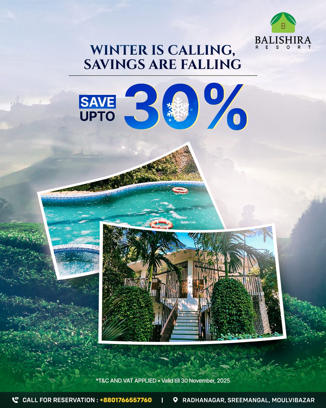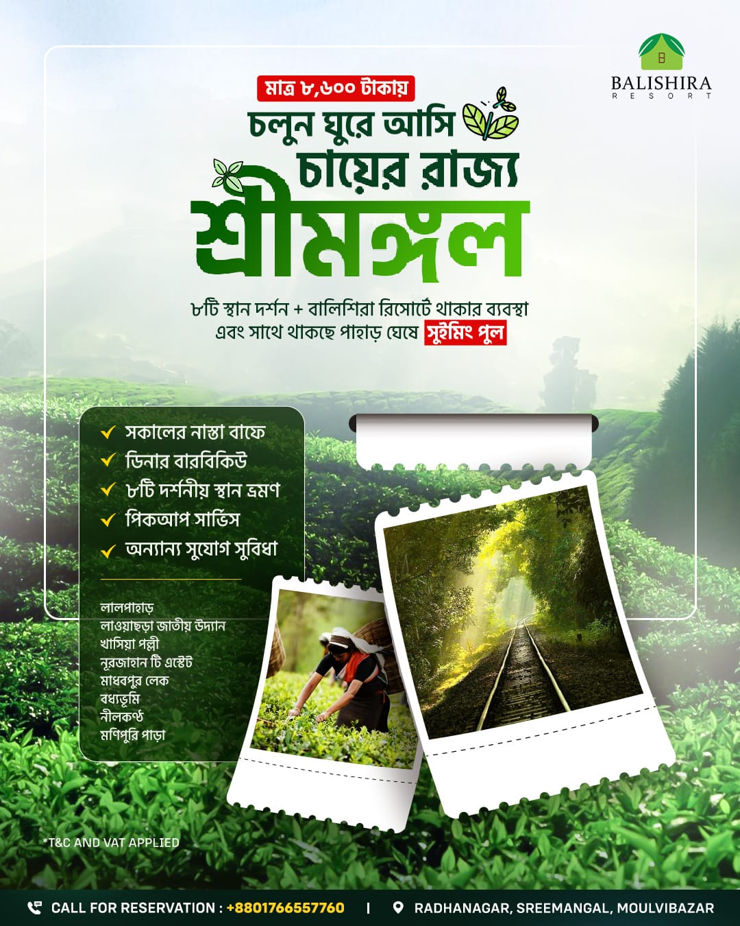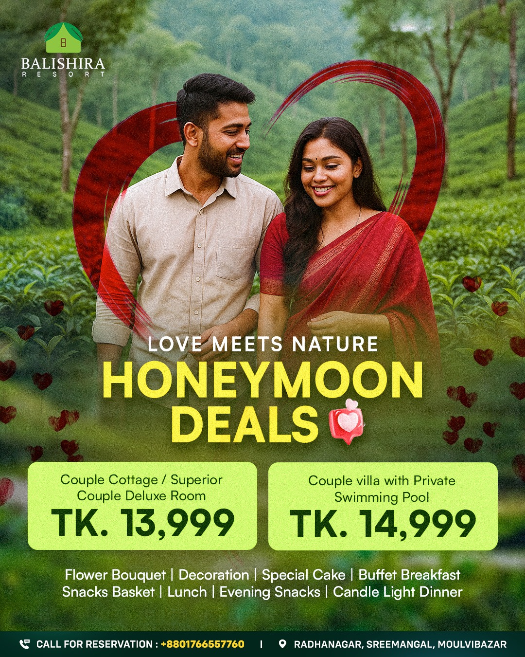 Balishira Resort is a nature-friendly luxury resort in Sreemangal’s hilly forest and tea gardens. It offers villas and cottages with views of a natural water stream, making it a perfect destination for nature lovers. The resort features modern amenities, including spacious rooms, a restaurant, complimentary breakfast, a private pool, air conditioning, WiFi Facilities, a kids’ play zone, and tour advising, providing everything needed for a relaxing and enjoyable stay.